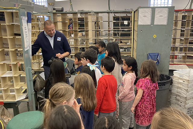 The experience wrapped up first grade’s letter-writing unit, which began with writing to adults at BDS. Eventually, letters were mailed to friends, families, and notable people beyond our community. First graders learned about the structure of a letter, how to write a letter, the format of an envelope, and how to stamp and mail an envelope. During the field lab, students asked many excellent questions. They learned interesting information that complemented what they learned and did during their writing project, such as why we need zip codes, what zip codes mean, and how addressing an envelope works.