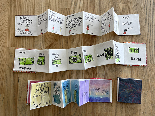 Second graders are finishing a mixed media bookmaking project, an eight-page accordion book. Each student brainstormed about a topic for their project, and among many choices were how-to books, books about favorite animals, foods, sports, or activities, books about how to make a particular recipe, and books on how to draw certain images. Students used book boards and special papers to make hard covers for the front and back of their books. Second graders then used various materials to illustrate each of the eight individual pages, including pencils, pens, watercolors, and crayons. They used bookmaking tools such as PVA adhesive glue and bone folding tools to fold the accordion and secure the glued pages to assemble their books. Each book is a unique artwork highlighting students’ interests and favorite art media.