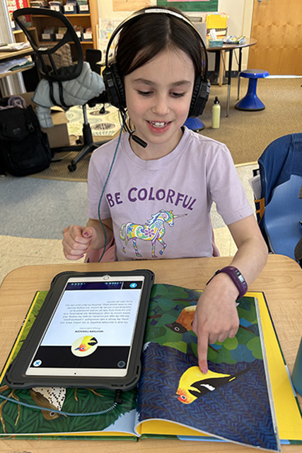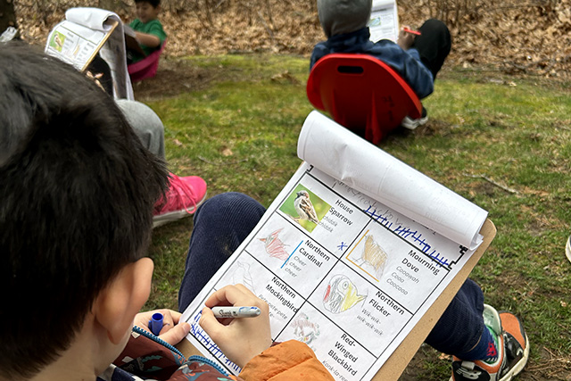 In week two, the second grade tried their hand at documenting the bird data as well as conducting some outdoor observations. Over the past few weeks, students have worked with Ms. O’Brien, Mrs. Fell, and associate teacher Mr. Hacker to learn specific bird songs. Each student practiced learning about several birds using the book Listen to the Birds, which employs augmented reality (AR) to enable users to point an iPad at a picture of a bird from the book and hear its call (and see the bird open its beak and flap its wings). Students then used the book and app to test their bird song identification skills. Students are now working to apply these new skills to birds in the wild to develop an understanding and appreciation for the wildlife diversity in our area.