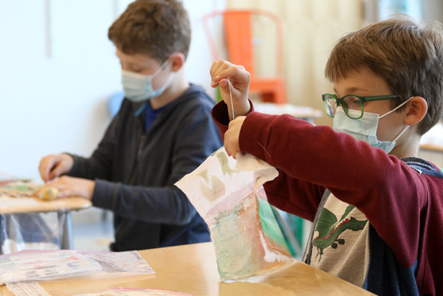 Students in fourth grade art class just completed their handsewn quilts inspired by an investigation of African American quilting traditions. Students learned about the Gee’s Bend quilting tradition from rural Alabama that began in the 1800s and is still vibrant today. Beginning as a necessity, these fabric artworks have emerged as an American art form. In addition, fourth graders looked at the two surviving story quilts made by enslaved artist Harriet Powers from Georgia. After designing a geometric or figurative quilt, each student used watercolors to tint their fabrics. Cutting shapes and forms they pinned and sewed a quilt top by using needles and thread. Next, they put together the three layers: quilt top, batting layer, and the quilt back. As a final step, they used quilting stitches to bind all the layers together to create one-of-a-kind fabric artworks.