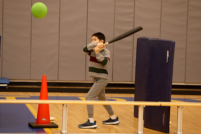We set up the Barn gym with six batting cages, a safe zone just beyond the cages where only teachers are allowed, and then an outfield for the students. Each batter gets to hit two dodgeballs. As soon as an outfielder collects two dodgeballs, they get in line at the cages for their turn to swing.