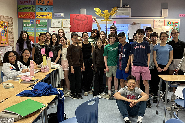 For April Fool's Day, Latin students prepared a homemade aquila (eagle) standard that Roman soldiers used as a flag, a scroll to read from, a helmet, and a red flag that a modern-day Roman Empire might use. Then, at the start of class on April 1, and to the sound of Roman trumpets on a speaker, the seventh graders marched downstairs with their gear to "invade Gaul" (meaning: to surprise the French class). Middle school French teacher Luc DeArmey was in on the joke, and both language classes shared a fun and 'historic' moment.