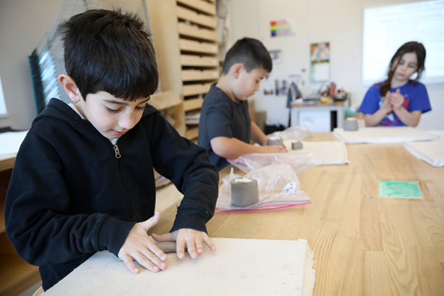 Second graders are making ceramic bells in art class this term. They first learned how to roll clay coils in a consistent diameter. Using a cup as a mold, they wrapped the coils around the mold to form the basic bell shape and then smoothed or welded the coiled surfaces together. Next, students added shapes onto the clay surface using extra clay and used tools to inscribe into the clay to finish the basic form. Using a method called “scratch and attach,” artists learned how to add pieces to clay forms by scratching the adhering surfaces, applying a layer of water, and finally applying pressure to make the pieces stay together. They based their creations on animals, patterns, sports, and other interests. To finish these handmade bells, second graders will add glazes, a handle, and a clay clapper to make the bells ring!