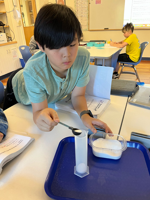 This week in sixth grade math, students explored how it takes more of a smaller unit or fewer of a larger unit to measure the same quantity. Students used many methods to learn and play with this concept. The pictured student used a teaspoon to see how many teaspoons of salt you need to fill a graduated cylinder to 20, 40, and 50 milliliters. Another group weighed different items to see their weights in ounces, pounds, grams, and kilograms. Did you know that a liter is slightly bigger than a quart? Our sixth graders do!