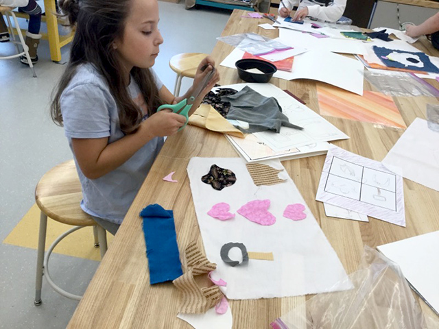 Students in fourth grade are making their own hand-sewn quilts in art class. They looked at a variety of examples including Gee Bends quilts from Georgia, Harriet Powers’ story quilts, and other American quilting traditions based on geometric patterns. Students first made a paper design using rulers, pencils, and templates. Next, they cut shapes in fabric for their quilt top. Each quilt will be made with three layers: a top, the center, or the batting layer, and the back. The students will sew these layers together and then add quilting stitches with sewing machines to complete these projects.