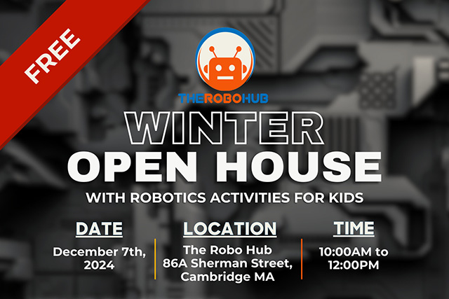 The Robo Hub, located at 86A Sherman Street in Cambridge, will host a winter open house this Saturday, December 7 from 10 a.m. to noon. Kindergarten to fifth grade students and their families are invited to stop by. Students can make robot ornaments or keychains to take home, meet our engineers, and explore hands-on robotics activities. There will also be coffee and goodies for parents.