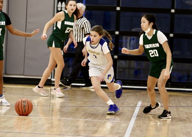 The girls’ varsity basketball team squared off against Park in their season opener this week. With the Barn bleachers full of fans, the Blue & Gold controlled play from the jump and held a lead for the entire game. Team captains Avery Schneider and Quincy Treisman led six players in the scoring column in what proved to be a balanced Belmont Day offensive attack. Defensively, the Blue & Gold locked down Park’s offense, standing up to their physical play and aggressive rebounding. Sixth grade rookie, Sara Colangelo, was dynamite off the bench, forcing six turnovers and burying a pair of jump shots. Likewise, eighth grade veteran, Ilana Brauner’s feisty defense and calm offensive presence helped set the tone for the victors throughout the contest. The team will take their 1-0 record on the road to Charles River next week.