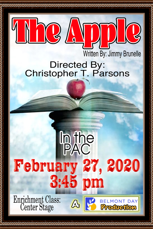 The enrichment class, Center Stage Players, proudly presents the sassy and satirical production of “The Apple.” The play deals with the perceptions that people have of and project upon art. It explores, in an absurd way, how some people mistakenly think the work of art is responsible for their perceptions, and how sometimes this thinking can culminate in an act of censorship. The show is open to all families and faculty.