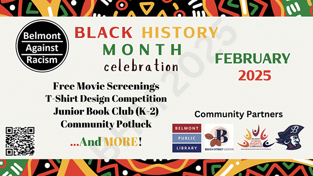 Belmont Against Racism in partnership with community organizations including the Belmont Public Library and the Belmont Human Rights Commission is celebrating Black History Month with a variety of great opportunities for families to learn, share, and gather. Events and resources planned and offered include a community potluck, a t-shirt design contest, movie screenings, a youth book club, and reading lists for all ages.