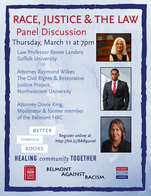 Join Belmont Against Racism on Thursday, March 11 at 7 p.m. for a discussion on race, justice, and the law with Professor Renee Landers and Attorney Raymond Wilkes with moderator Attorney Dovie King. The discussion will explore the history of legislation promoting civil rights, works of restorative justice to right historical wrongs, and what more should be done to promote true equity. This program is co-sponsored by Belmont Against Racism in conjunction with Belmont Public Library’s reading of Say I’m Dead: A Family Memoir of Race, Secrets, and Love by E. Dolores Johnson for their Better Through Books: Healing Community Together. Click here to register for this event.