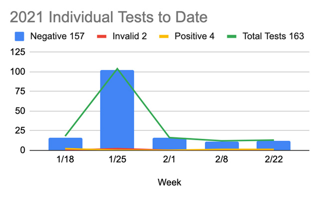 In our testing after our return from break, we had one positive pool and one subsequent positive individual test. All other tests so far this week have been negative!