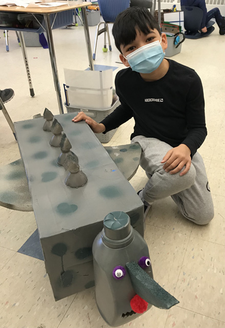 Third graders in Ms. Twarog’s cohort have been learning how physical and behavioral adaptations help animals to survive. After exploring adaptations that help animals in particular ecosystems, students were tasked with creating their own animals. Each of their animals fit within an existing food web and were adapted to live within one of four major biomes. Some of the adaptations students needed to include for their animals were body coverings to survive in their biome, ways to help them get food, and the ability to defend themselves from predators.
