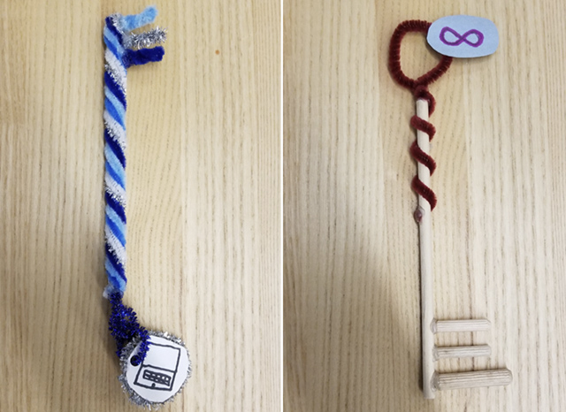 In fifth grade, students worked on their “Key to Understand the Beauty of Others” project. In this activity, students constructed a physical symbol of the “key” to understanding. In chapter two of The Arrival by Shaun Tan, we see the main character insert a key to unlock his new home, and attached to this key is a symbol. Students constructed a similar key and attached a symbol to it. The symbol represents an idea, concept, or behavior which they felt is the “key” to understanding the unique beauty of others. Here are two students’ keys and explanations.