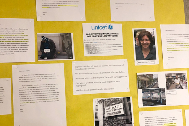 Grade eight French students wrapped up a unit about house and home with an activity focused on the issue of homelessness in Paris and Boston. The students read an article in French and one in English on the issue. We learned about Pine Street Inn in Boston and a shelter in Paris. The students then designed the elements of a homeless shelter that would provide visitors with what they need, both tangibles and intangibles. We wrote letters to the Mayor of Paris, Madame Anne Hidalgo, and sent her our suggestions this week via the City of Paris website. It will be interesting to see what responses we may receive. If you’d like to see the students’ letters, they are on display in the Kiva.