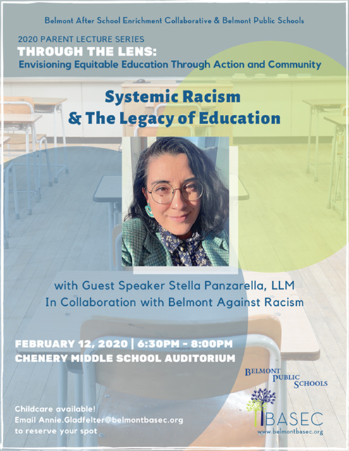 Please join the Belmont After School Enrichment Collaborative and Belmont Beyond Racism for the 2020 Parent Lecture Series, Through the Lens: Envisioning Equitable Education Through Action and Community. The next guest speaker will be Stella Panzarella, LLM, director and co-founder of the Anti-Racism Collaborative and an anti-oppression organizer in the greater Boston area. With historical and systemic models for reference and a dash of memes for good measure, our speaker will take attendees on a journey of lens-building and reframing of an understanding of racism and oppression within and beyond the Belmont community. This workshop is designed to support a nuanced understanding of the multiple levels of oppression pertaining to equity in education. This presentation includes pauses for reflection, dialog, and Q&A. For more information, click here.