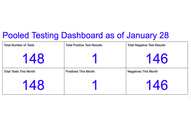 We are finishing our second week of testing. Each week, you will see two dashboards here; one a chart of pooled tests and the other a graph of individual tests. We have tested a total of 148 pools; of those pools, we had one positive result, one invalid result, and 146 negative results. Of those 105 individual tests, two have returned positive results, including the reflex test of the positive pool.