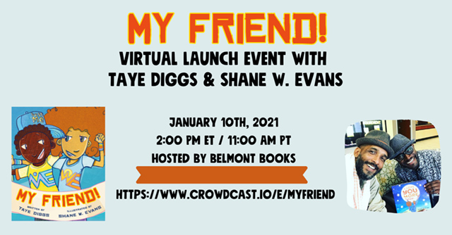 Join beloved actor Taye Diggs and award-winning illustrator Shane W. Evans, the writer and artist team that brought us Chocolate Me! and Mixed Me!, as they discuss their newest picture book My Friend! Belmont Books, in conjunction with Macmillan Publishing, is excited to share this free and fun event. Click here to register for this event.