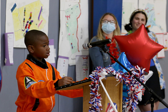 Third graders celebrated the State Fair on Tuesday to a packed house of families and faculty. The fair is a beloved annual event in which students showcase their learning from the past two months of state research. The students took turns proudly sharing in a short speech a few interesting facts about their state and something important they discovered about themselves as learners.