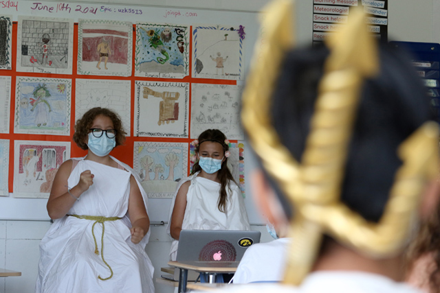 On Thursday, our fourth graders had a hybrid Greek Storytelling Festival with students on campus and parents joining via Zoom. The day began with a slideshow of our Greek Olympics and a message from Zeus at Mt. Olympus. Then families broke up into cohort Zooms and enjoyed hearing some ancient myths rewritten and performed live by students. Part two of the celebration happens at home where fourth graders will share their ancient Greek digital magazine which offers advice from the gods, an interview with a mortal, highlights from the journal of Odysseus, and more! Thanks so much to the kitchen team for providing yummy Greek food, such as spanakopita, for us to try.