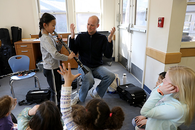 This week in second grade music, students were treated to a visit from our resident wind ensemble director and clarinet maestro, Kristian Baverstam. Our second grade musicians have spent the last few classes exploring the world of wind instruments, investigating how they function and what kinds of music people make with them. Mr. Baverstam stopped by to give a practical demonstration, including renditions of music from Star Wars, Peter and the Wolf, and the famous Rhapsody in Blue introduction. The students were amazed to hear the range of the clarinet and were delighted to see one of their classmates try it out for the first time.