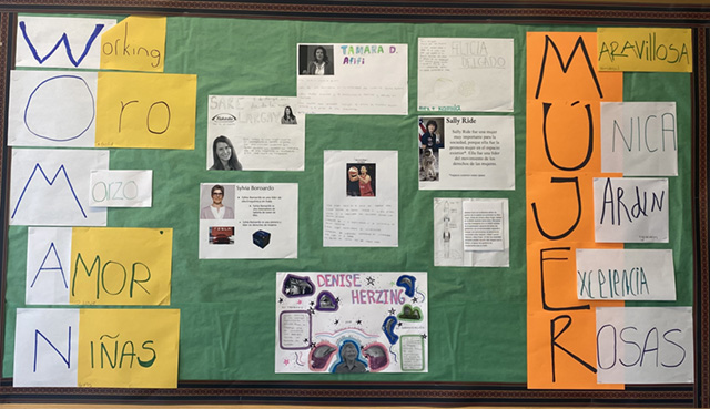 Sixth and eighth grade Spanish students contributed to celebrating Women’s History Month. In sixth grade, students worked on an acrostic poem with the words MUJER and WOMAN; they reviewed previously learned vocabulary and learned new words from peers, and some of them looked at the Pictionary they made at the beginning of the year. Eighth graders wrote descriptions of their Capstone projects and honored women who contribute to a variety of different fields. ¡Felicidades!