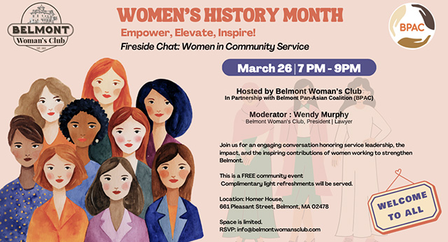 In collaboration with the Belmont Woman’s Club, the Belmont Pan-Asian Coalition will host its second annual Women’s History Month event to celebrate Women in Community Service on Thursday, March 26, 2026, at 7:00 p.m. at Homer House, 661 Pleasant Street, Belmont. The event will be a panel discussion and fireside chat dedicated to honoring service leadership, their impact, and the inspiring contributions of women working to strengthen Belmont and beyond.