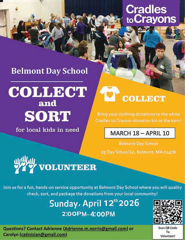 Clean out your closets and help a child in need–every item makes a difference! The Belmont Day School Cradles to Crayons drive is underway and runs through April 10, with a community sorting event on Sunday, April 12, from 2:00 to 4:00 p.m. at BDS.