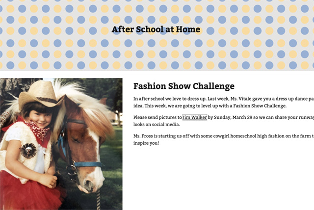 Our after school team has put together a website chock full of wonderful activities for students when school time has ended for the day. These activities continue our program’s mission of fun with the intention of enhancing skills, spurring creativity, and building community. Each week the team will update the site with new options. Click here to visit the site.