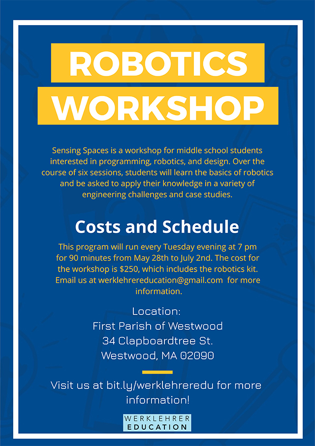 This six-session workshop is geared to middle school students who want to learn the basics of robotics. Lessons will include engineering challenges, programming, design, and case studies. For more information and registration, email werklehrereducation@gmail.com
