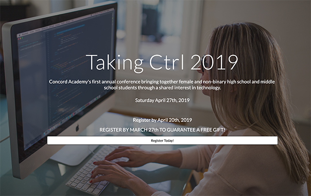Join Concord Academy for the first annual conference bringing together female and non-binary high school and middle school students who share an interest in technology. The conference will include a keynote speaker, workshops, and an internship social session. Register by April 20. For more details, visit the Taking Ctrl 2019 website.