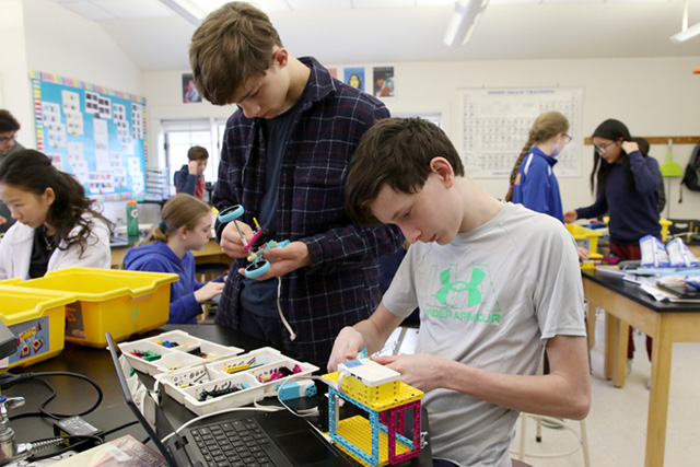 Students in science classes have been using LEGOs recently to build their design and coding skills as they gear up for their next physics unit focusing on Newton’s Laws of motion. Each day students come to class and face a new design challenge that ranges from building the perfect amusement park ride to a cozy chair for Stephen, the 96-year-old sheep, or a vehicle that uses something other than wheels to move. These LEGO-builds are then brought to life using word block coding, in a Scratch style, in which students tell motors to move at a certain speed and distance or a sensor detects colors telling a vehicle knows when to stop. As students become more comfortable with the engineering of LEGO, this work will be connected with our study of Newton’s Laws. All this hard work will be displayed at the upcoming Belmont Day STEAM Expo on May 3, hosted by the middle school science department along with Annie Fuerst and the technology and innovation department. Stay tuned for more details on the expo!