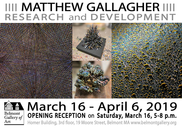 Belmont native and now notable Cleveland-based artist/musician Matt Gallagher returns to Belmont with a solo show at the Belmont Gallery of Art. Gallagher’s Research and Development exhibit will feature over thirty unique paintings and sculptural pieces. For more information and gallery hours, please visit www.belmontgallery.org.