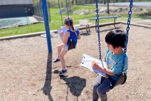 This week, scientists in first grade learned how to make observations, using four of their five senses, hearing, sight, smell, and touch. On their first scientific excursion to the playground, students noted they could feel the warm breeze, smell wood chips and flowers, see the trees, and hear the birds singing. They then used sketches to help other scientists know where they took their observations. Building on their unit on weather, students described the color of the clouds they saw, sketching the small amount of clouds in the sky on a sunny day. Keep a lookout for these scientists as they continue investigating their surroundings at BDS.