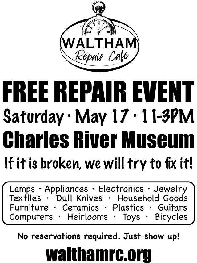 Have an item at home that’s not working but you don’t want to just chuck it in the trash? Bring it to the Waltham Repair Cafe, this Saturday, May 17, from 11:00 a.m. to 3:00 p.m., at the Charles River Museum of Industry and Innovation at 154 Moody Street. If it’s broken, the volunteers will try to fix it! Click here for more information on the event and the organization.