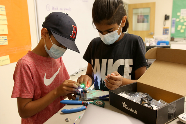 Sixth grade students have been studying electricity for the past several weeks. After learning about parallel and series circuits as well as various electrical components, they were tasked with putting their knowledge to use to build something that used lights and a switch. They had cardboard, lightbulbs, LEDs, batteries, wires, copper tape, and whatever else they needed to build their creations. Some examples of projects were: flashlights, stoplight replicas, lightsabers, lamps, illuminated designs, a fortune teller, a guitar that lit up when you “plucked” the switch and a mini-piano where each key was a switch. There was also a mini version of a staircase to show how to connect the circuit so the lights could go on or off at the top or bottom and many other innovative ideas. There was a lot of problem-solving, innovation, and fun as students extended their knowledge of circuits.