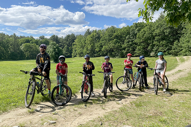 Belmont Day’s mountain biking team has grown exponentially in gnarliness since its inception four years ago. This year’s squad benefitted from extended Monday rides, leveling up throughout the season and culminating in the first-ever MTB “away game” at Great Brook Farm on Wednesday. The “opponents” were the roots, rocks, bridges, boulders, trees, and even a horse on the path. Aside from the horse, the team skillfully dispatched the opposition. Ella “Kamenskillz” Kamenski and Clark “Rutherfire” Rutherford showed their resilience on a steep climb, “Captain” Sal Pattisall used their eighth grade leadership and horse knowledge to guide the team around the four-legged beast, and Altay “Jomazing” Jomazer, Eyan “Mount” Morales, and Ewan “Double Ew” Wheeler were nimble and relentless. The team logged a 5+ mile shred that not-so-coincidentally ended up at the Great Brook Farm’s homemade ice cream stand. It was the last obstacle of the day, and they proved up to the challenge.