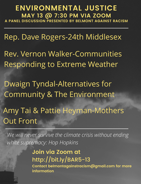 Belmont Against Racism will be hosting a panel discussion on the issues and efforts around environmental justice on Thursday, May 13 at 7:30 p.m. via Zoom. The panelists will be state Rep. Dave Rogers of Cambridge, the Rev. Vernon Walker with Communities Responding to Extreme Weather, Dwaign Tyndal with Alternatives for Community & the Environment, and Amy Tai and Pattie Heyman with Mothers Out Front. All are invited to attend. Click here for Zoom link to the event.