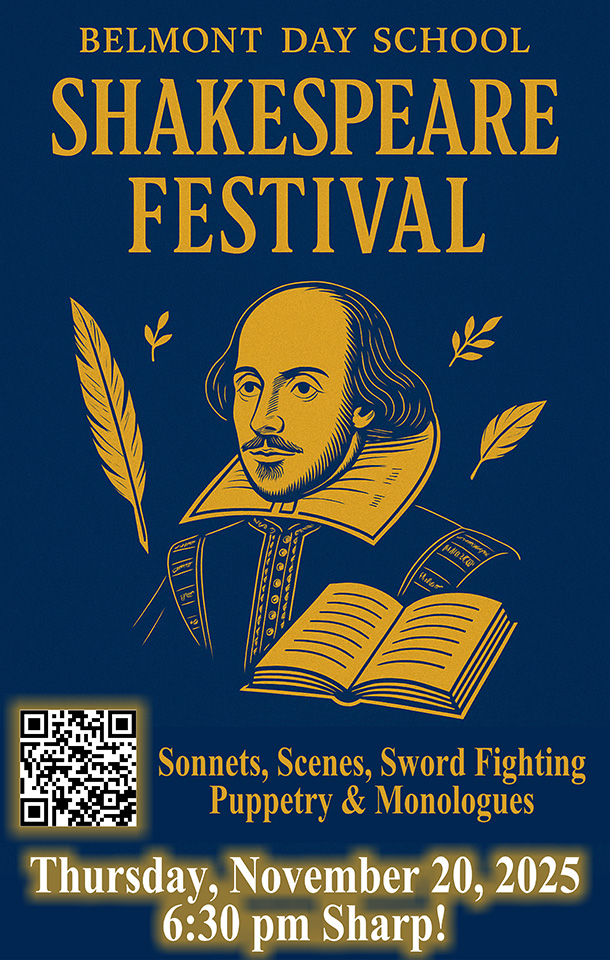 Hark! Gather ye, noble families and curious minds! The Palandjian Arts Center shall echo with verse and valor as Belmont Day School proudly presents its first-ever Shakespeare Festival! Prepare yourselves for an evening of most wondrous entertainment. Students from Mrs. Dempsey’s, Mr. Largay’s, and Mr. Parsons’ seventh and eighth grade classes will take the stage with scenes of comedy and tragedy, dazzling swordplay, heartfelt monologues, merry puppetry, and sonnets sweet enough to make the Bard himself swoon. Come forth and witness the timeless magic of Shakespeare brought to life by young scholars full of fire and fancy. Click the button below to reserve your tickets today!
