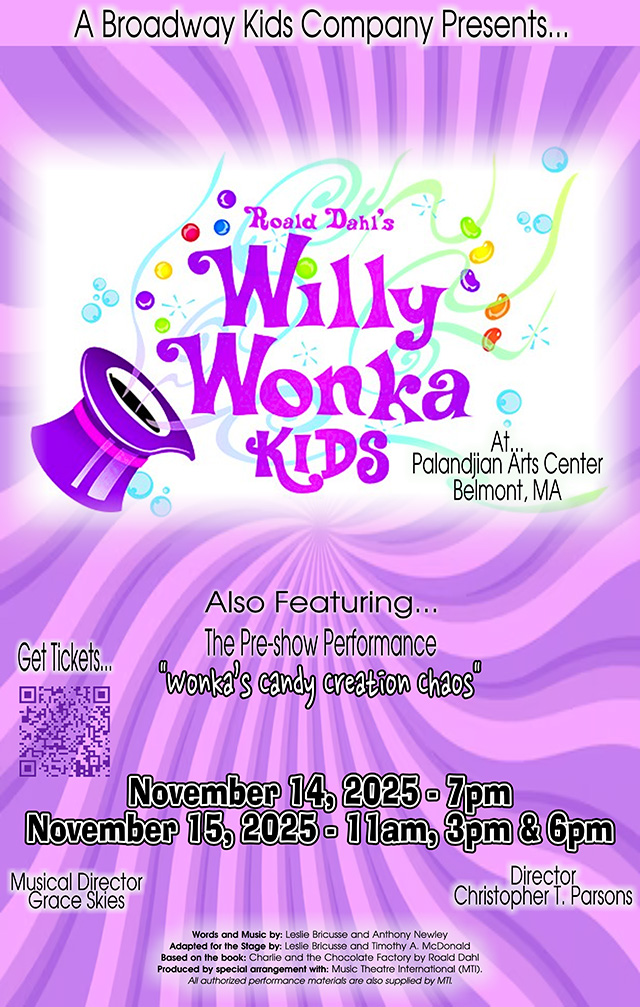 The stage is set, the golden tickets are ready, and excitement is building as A Broadway Kids Company–Arlington/Belmont prepares to bring Roald Dahl’s classic story to life in their upcoming production of Wonka Kids. Featuring a cast of talented young performers from across the community, this family-friendly musical promises music, laughter, and plenty of pure imagination as audiences are invited into Willy Wonka’s fantastical chocolate factory.