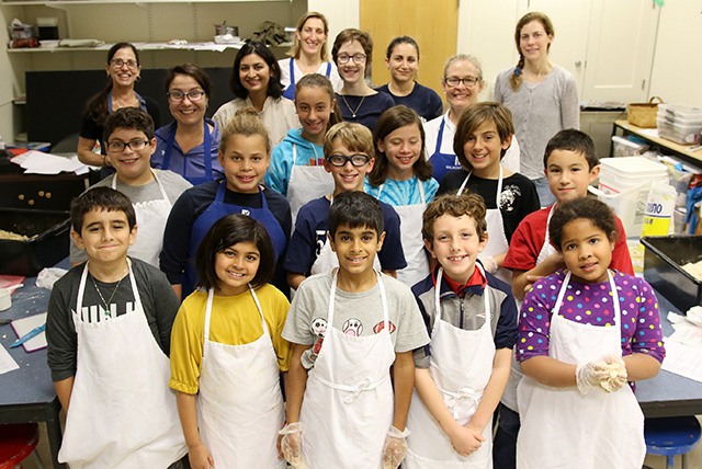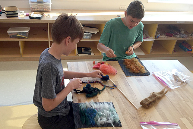 First graders prepare to do some painting in their woodworking class.