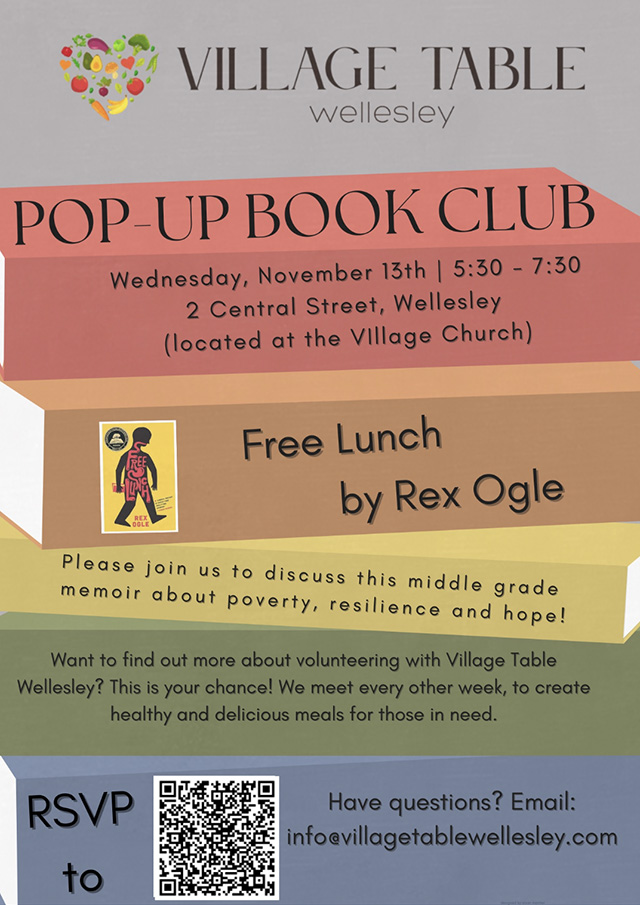 Middle School students and parents are invited to join Village Table Wellesley at a special "Pop-Up Book Club" focused on the middle-grade memoir Free Lunch by Rex Ogle. The book club-style event will be held on Wednesday, November 13 from 5:30 to 7:30 p.m. at The Village Church, 2 Central Street in Wellesley, and will include a dinner and an engaging discussion of the book. There will also be an opportunity to donate your copies of Free Lunch (hardcover preferred) to a classroom in the local area. For more information and to RSVP, scan the accompanying QR code.