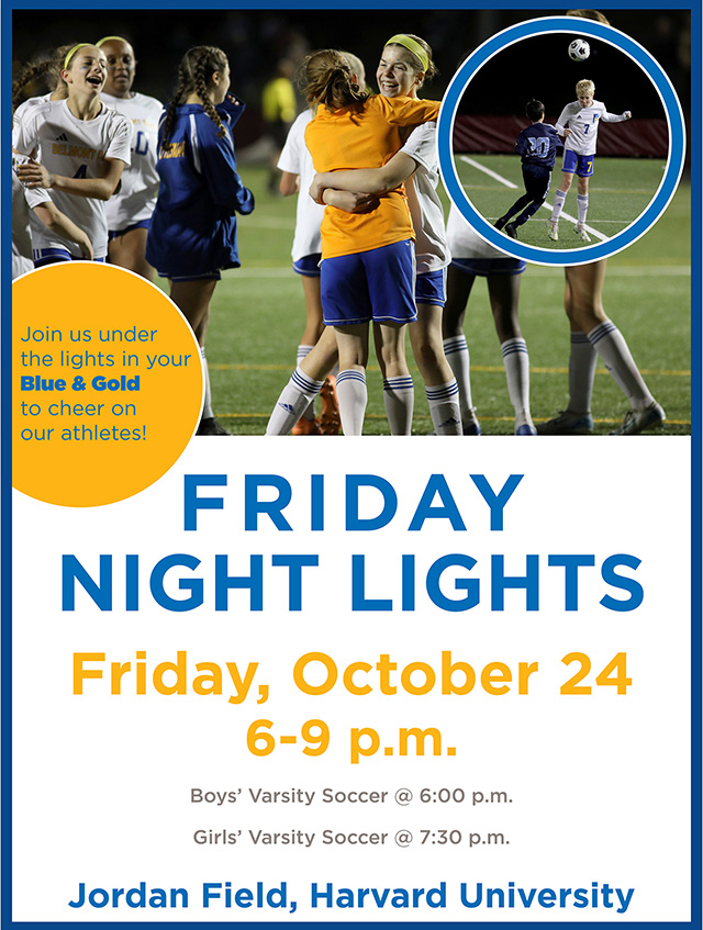 Tonight! Friday Night Lights, our annual varsity soccer match-up against the Meadowbrook School, returns under the shining lights of Jordan Field at Harvard University. Join students, faculty, parents, alumni, parents of alumni, and friends to fill the stands and show Meadowbrook how much spirit we have! Please read the guidelines and information in the dropdown below to help us ensure that all enjoy a fun, safe, and respectful event.