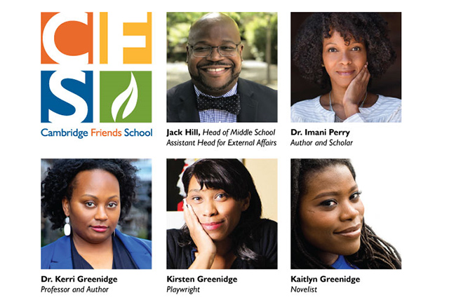 The Cambridge Friends School begins its annual speaker series on Wednesday, October 16 at 6:30 p.m. with an author talk with five distinguished panelists: Princeton professor and author, Imani Perry, historian, Kerri Greenidge, novelist and writer, Kaitlyn Greenidge, and award-wining playwright, Kirsten Greenidge in conversation with award-winning journalist and diversity advocate, Jack Hill. Click here for more information.