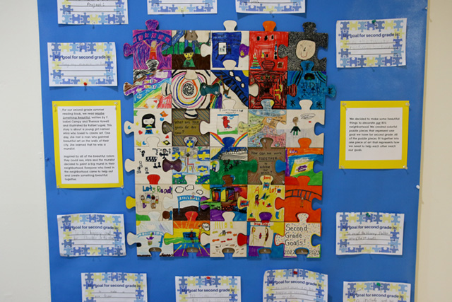 We decided to make some beautiful things to decorate our own BDS neighborhood. First, we brainstormed one goal we each have for second grade. Our goals are based on things in our control that we can achieve in one year. We then created colorful puzzle pieces with an image representing each of our goals. We put all of our puzzle pieces together because we know that when we work together, we can create great things.