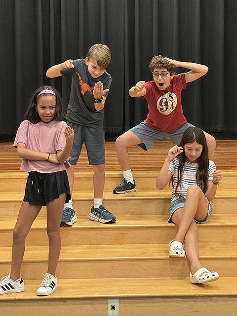 At the start of the year, students in fifth grade theater class jumped back into performance mode with the activity “character portraits.” Following a physical warm-up to spark their imaginations, the students transformed into groups portraying ballerinas, spiders, wilting flowers, cats, and wizards. They were also tasked with using varied heights and positions to add depth to their tableaux. Afterward, as they shared their favorite moments, laughter echoed throughout the Palandjian Arts Center.
