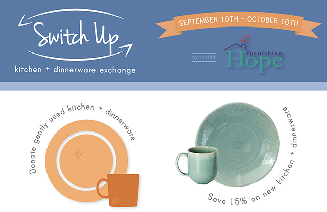 If you’re thinking of updating your dinnerware and kitchenware, now’s the perfect time! Didriks and Local Root in Belmont Center and Newton have teamed up with Furnishing Hope of Massachusetts (founded by Suzy Palitz P ’16) for a “Switch Up” fundraiser.