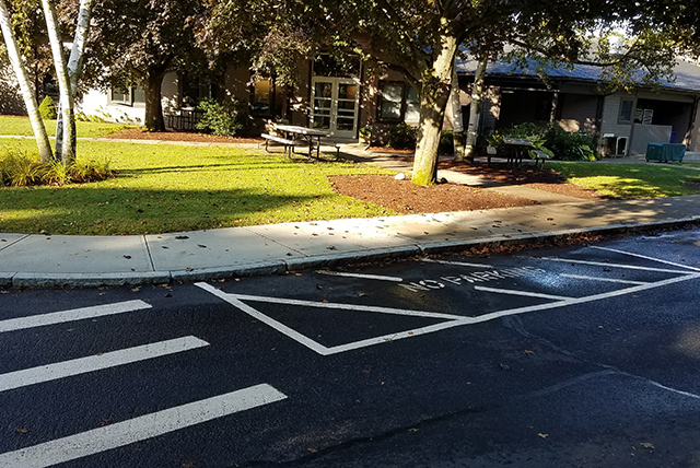 - Please do not park in the hash-marked area in front of Coolidge Hall (see photo). This is not a parking space and must be kept clear so that the buses can make the turn into the front circle.